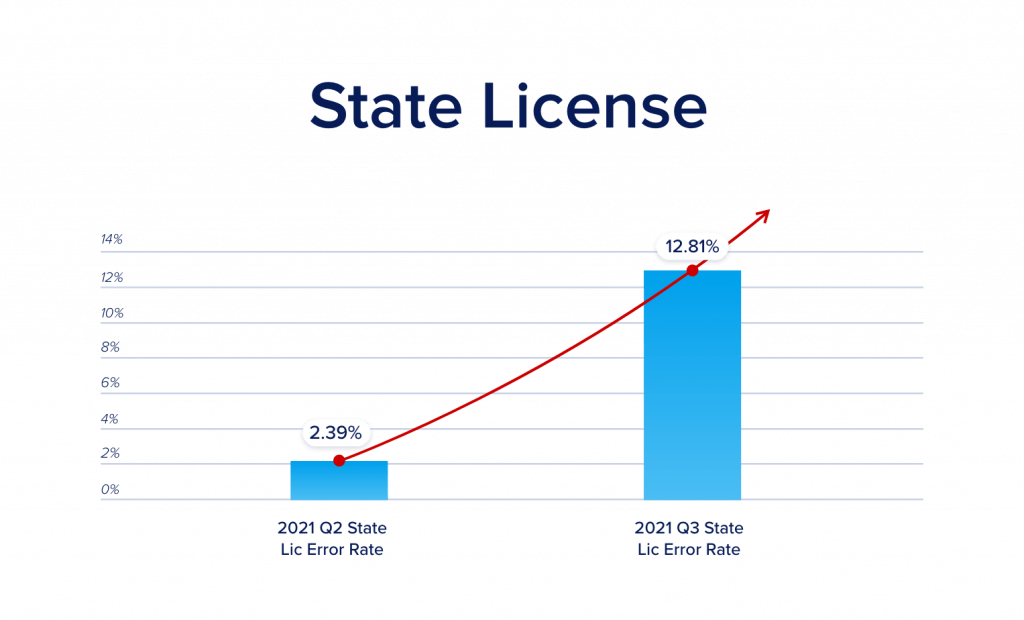Comparing Q3 2021 vs Q2-2021 there was an additional increase in fraud/risk exposure surrounding CPL errors/issues of 19.7%, a 6.5% increase in CPL/Agent validation errors with title insurers, and a 12.8% increase in state licensing issues among closing agents.